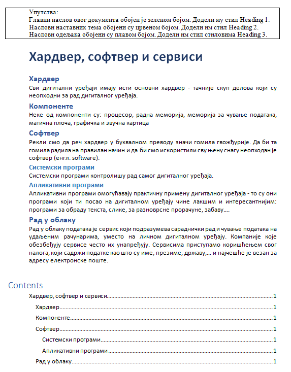 Пратећи упутства дата у документу, означи главни наслов, наслове наставних тема и наслове одељака стиловима Title, Heading 1 и Heading 2 (тим редоследом).
