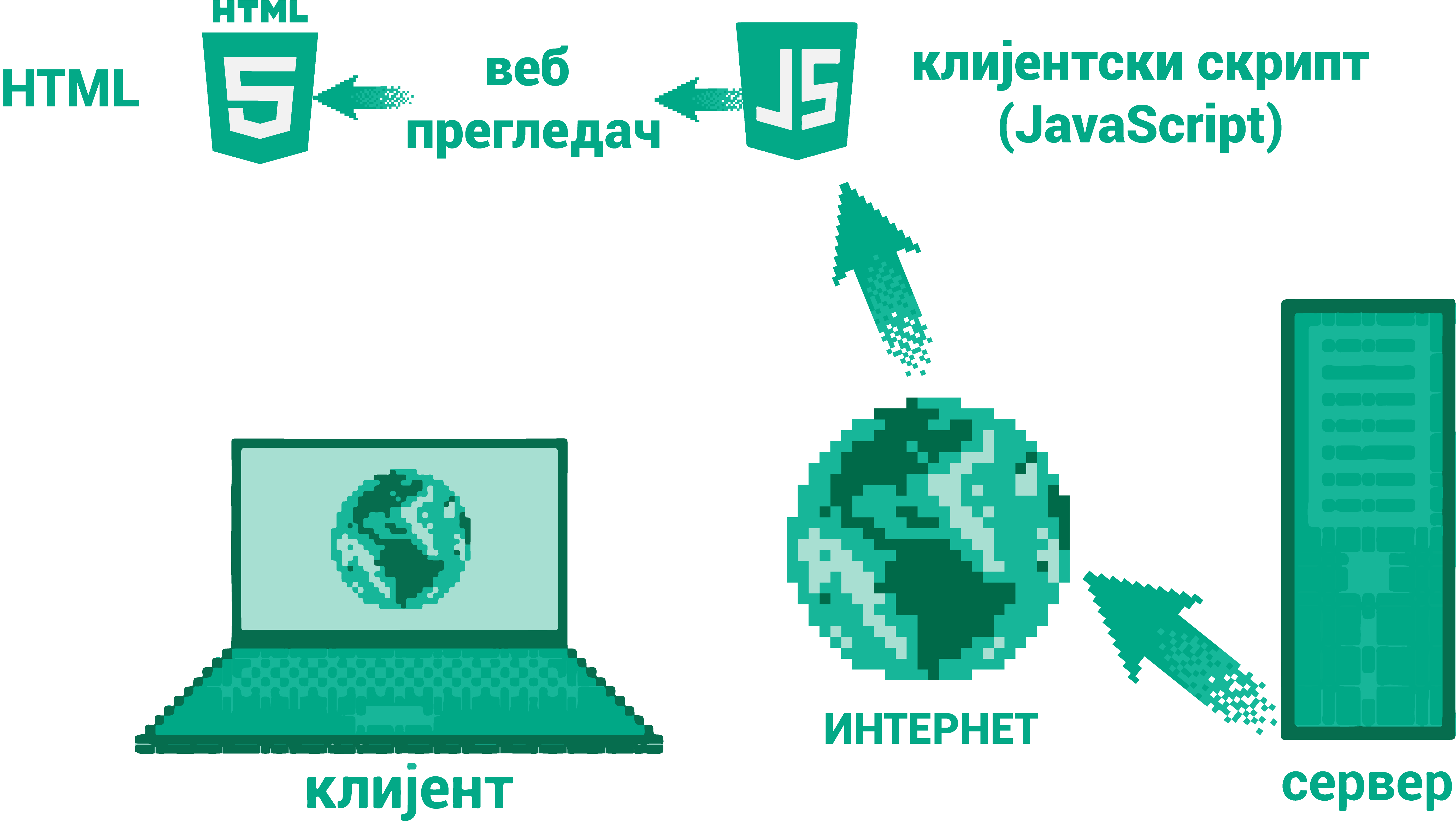 Прошле године смо се упознали са језиком JavaScript. Његов значај је у томе што сада са сервера на клијент, поред статичног садржаја задатог помоћу језика HTML и CSS, може да се достави и текст програма (тзв. скрипта) у језику JavaScript који се затим извршава унутар прегледача. Пошто се такви скриптови извршавају на клијенту, они се називају клијентски скриптови. Стране које садрже JavaScript називају се некада и (интер)активне стране.
