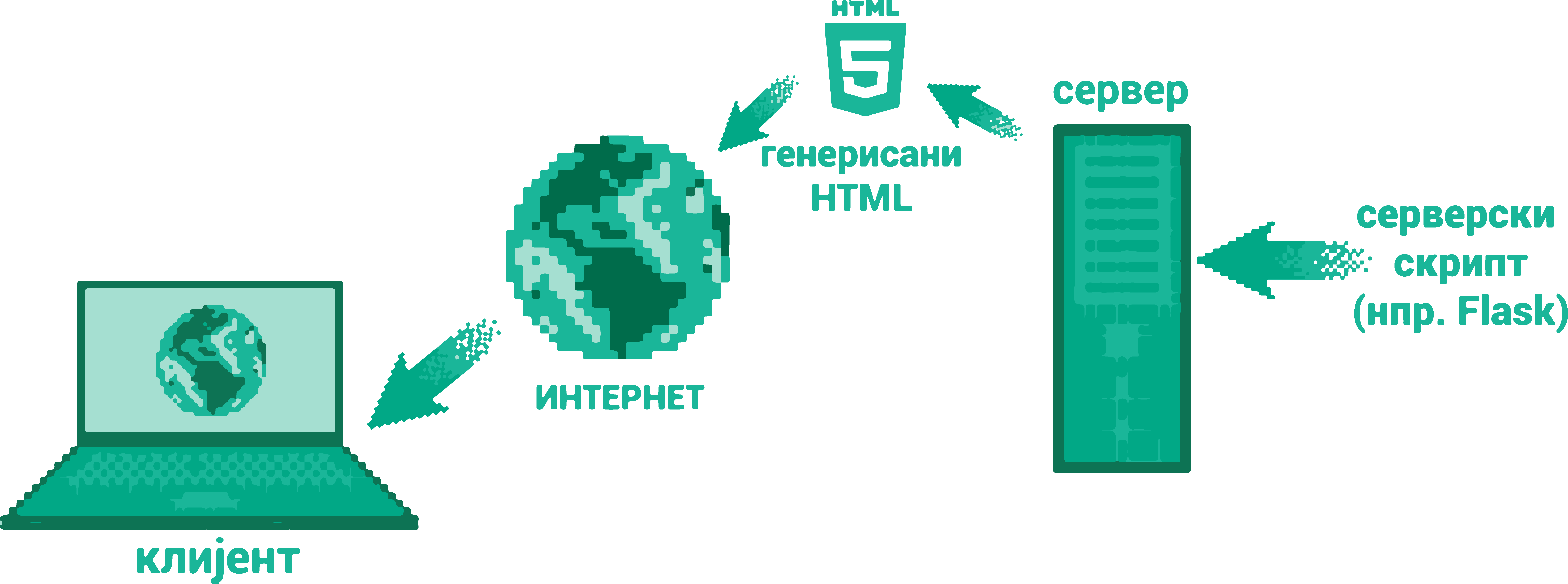 На наредној слици је приказан принцип рада серверских скриптова. Скрипт се извршава на серверу (самостално или у склопу неког ширег, веб-серверског софтвера, какав је нпр. Apache) и формира се HTML страница која се шаље клијенту.