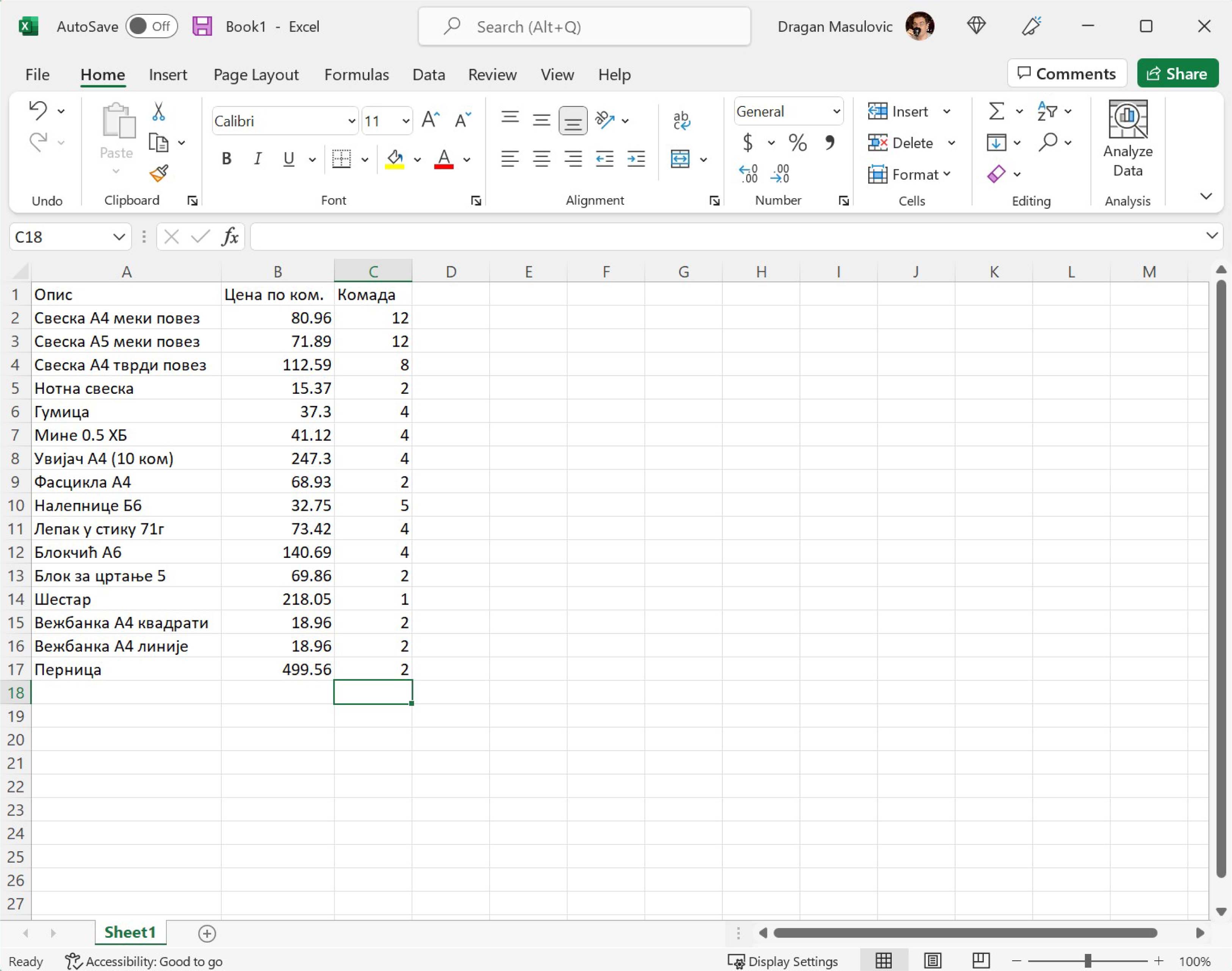 Сада ћемо направити нови празан документ и у њега унети табелу са почетка (куповина школског прибора). Не мораш да прекуцаваш податке. Уместо тога унеси неке своје податке, али води рачуна да табела треба да има три колоне које се зову: „Опис“, „Цена по ком.“ и „Комада“ и да мора да има барем 15 редова.