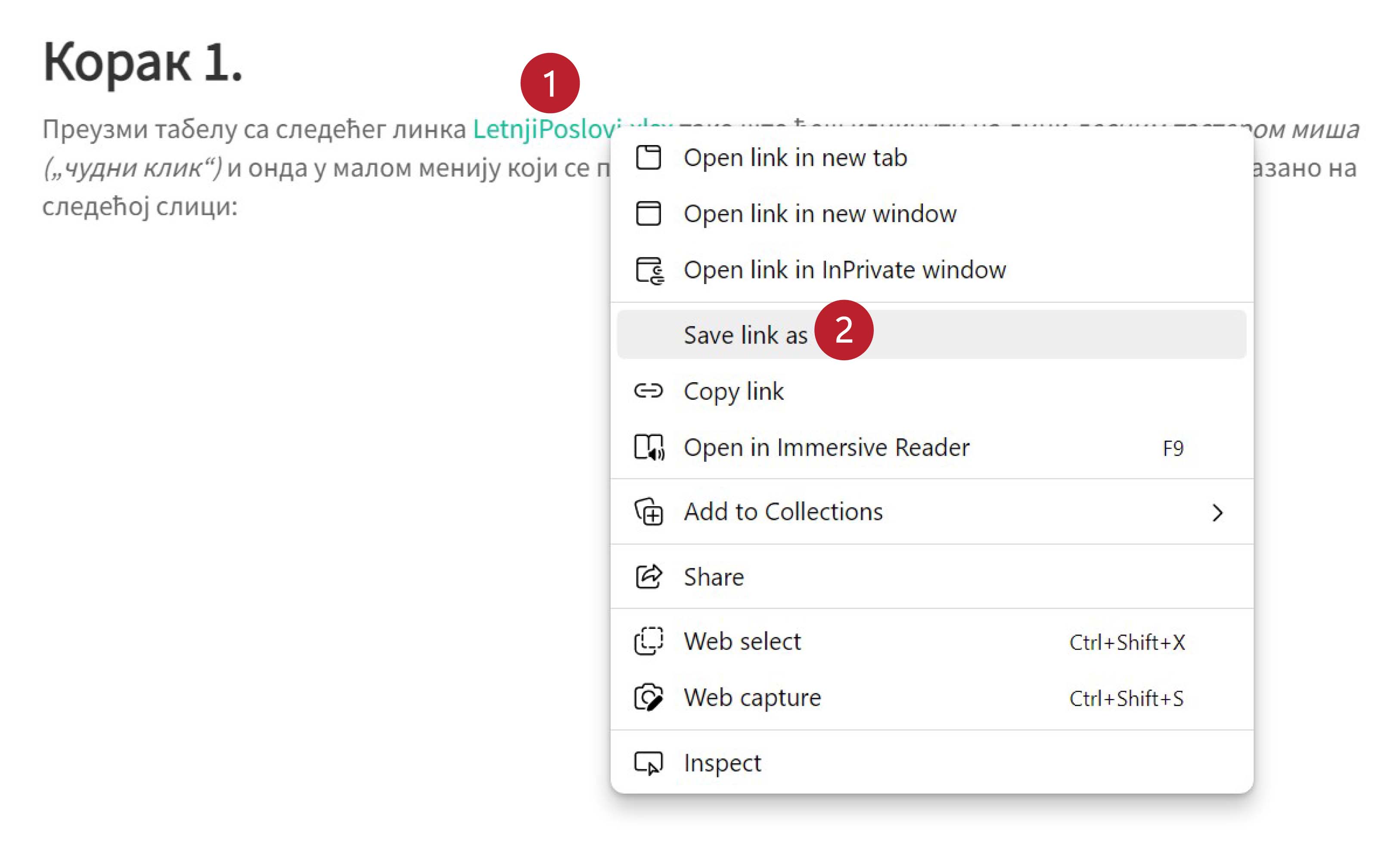 Преузми табелу са следећег линка LetnjiPoslovi.xlsx тако што ћеш кликнути на линк десним тастером миша („чудни клик“) и онда у малом менију који се појави одабрати опцију „Save link as…“ како је то показано на следећој слици: