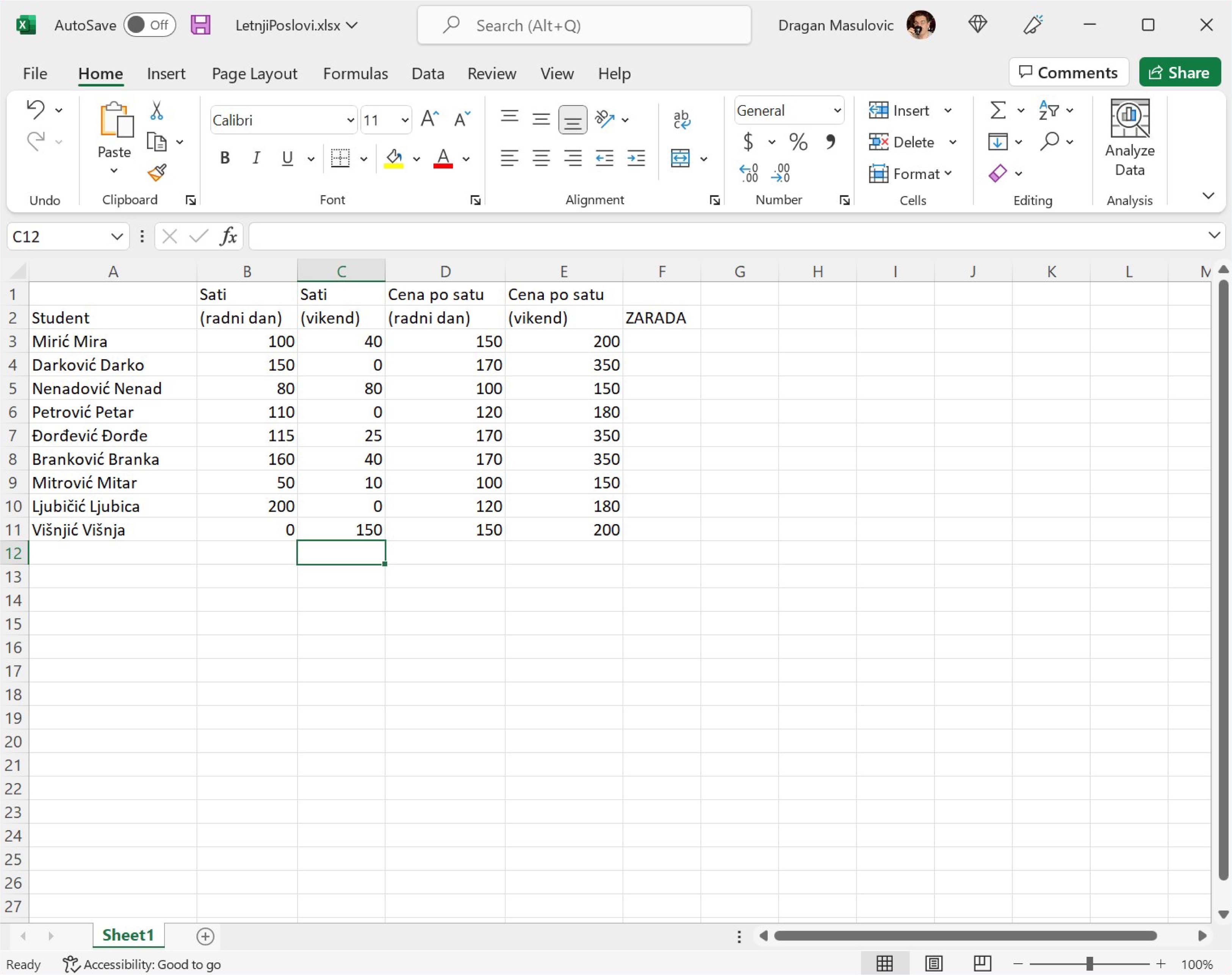 У ћелију A12 упиши „Prosečno“. Сада желимо да у ћелији B12 прикажемо просечно време које су наведени студенти провели на послу. Дакле, желимо да израчунамо просек бројева који су уписани у ћелије B3, B4, …, B11. Један од начина да то урадимо је да у ћелију унесеш формулу: