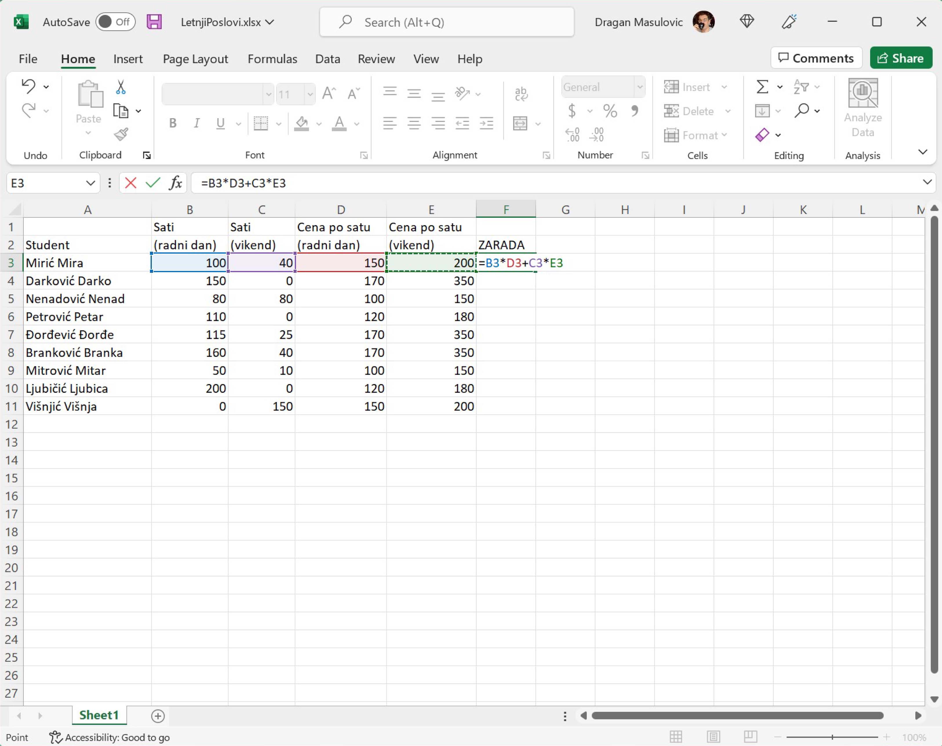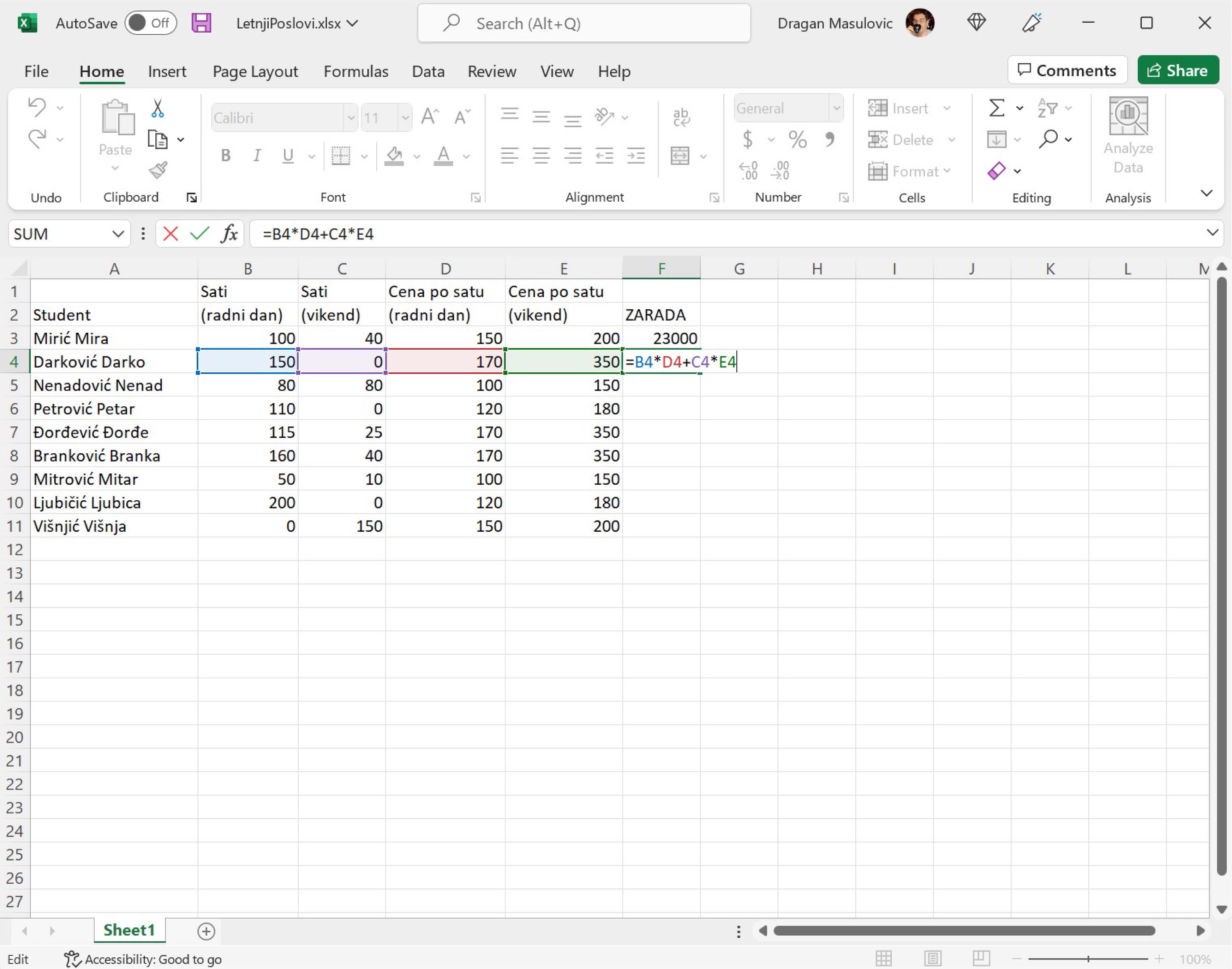 Сада за сваког студента унеси бројеве који представљају сате проведене на послу радним даном и викендом и израчунај колико је сваки студент зарадио на свом летњем послу.