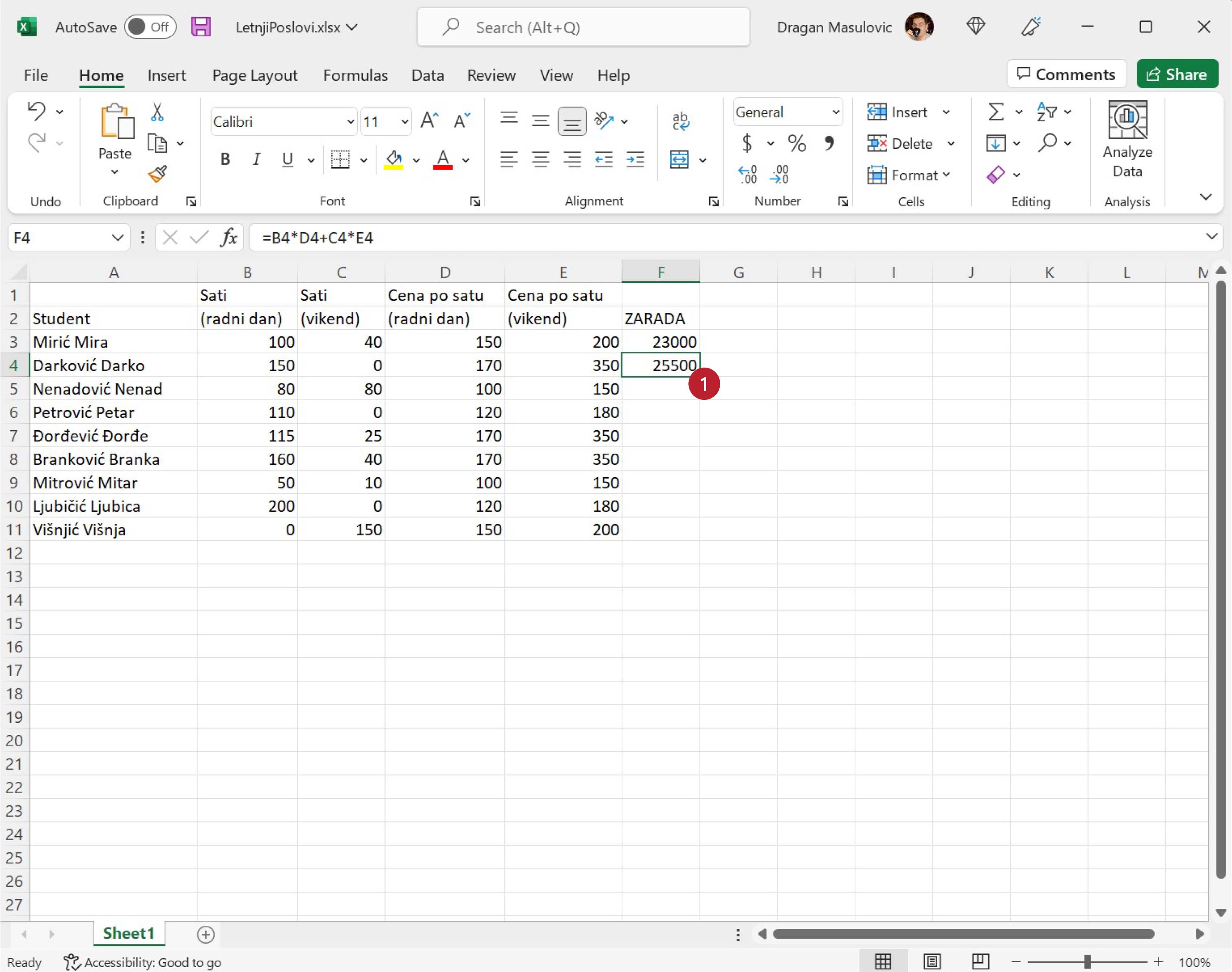 Вероватно ти се по глави већ мота она народна: „И тако летњи дан до подне.“ Да не бисмо исти досадни посао радили још сто пута (и при томе вероватно направили доста грешака), сада ћемо показати користан трик који ће за нас урадити посао. Кликни на ћелију F4 и примети да је доњи десни угао зеленог оквира око ћелије истакнут (оквир има „бубуљицу“):