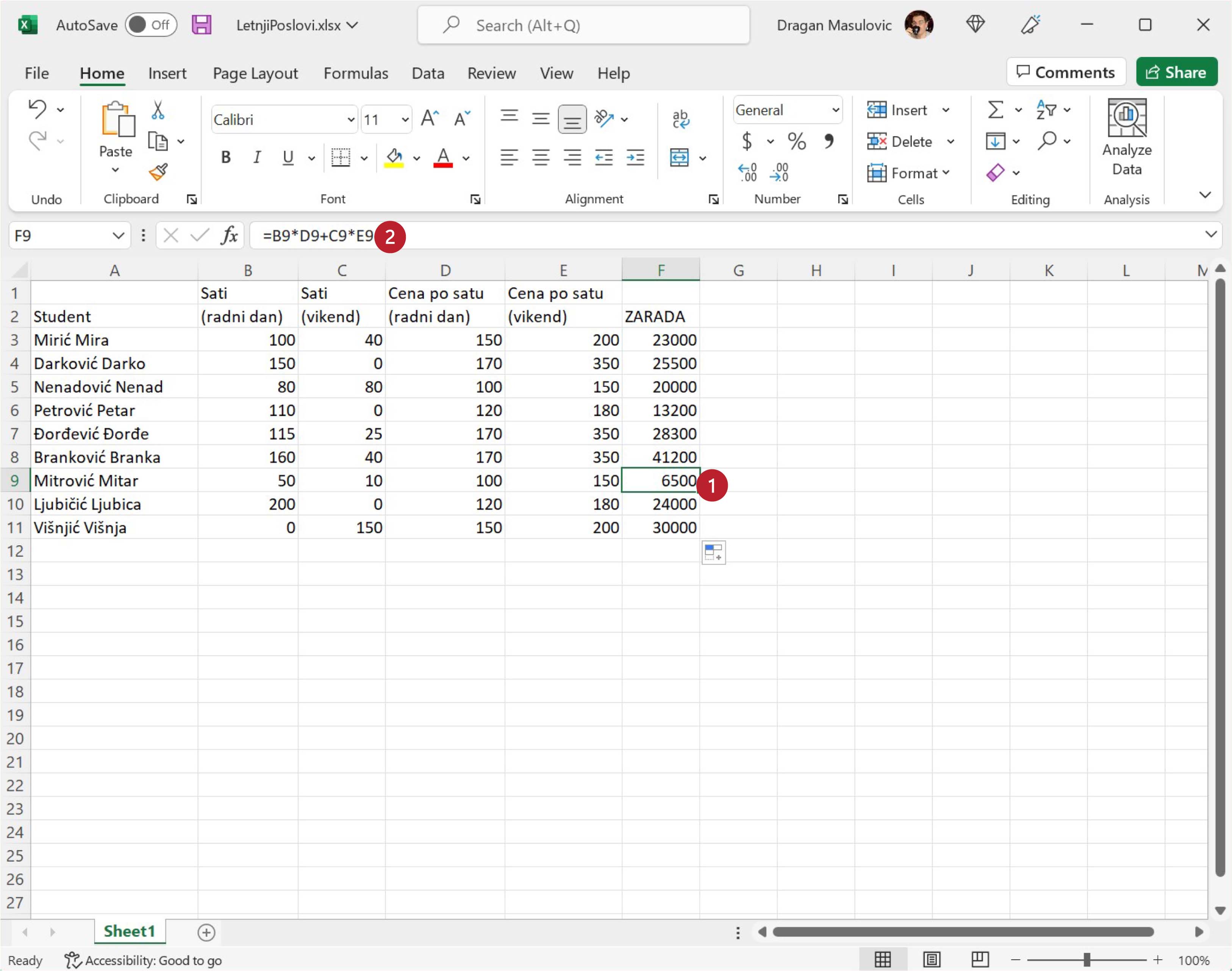 Кликни сада, рецимо, на ћелију F9 и погледај у оквиру за формуле (formula bar) која формула је уписана у ћелију.