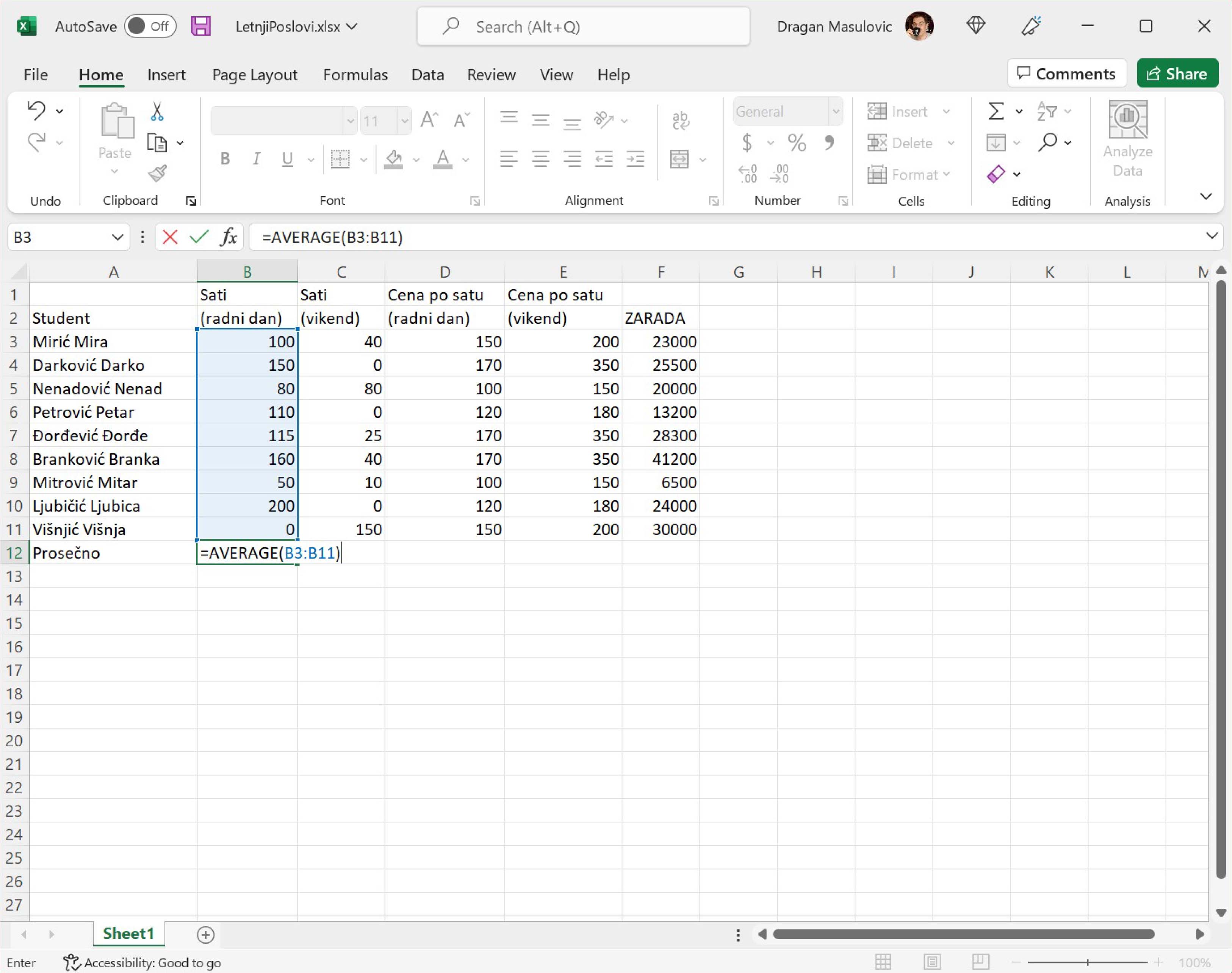 Израчунаћемо сада колико су просечно сати радили студенти радним данима и викендом, и колико су зарадили у просеку. Ексел може да аутоматски израчуна просек низа бројева, само треба позвати функцију AVERAGE („просек“).