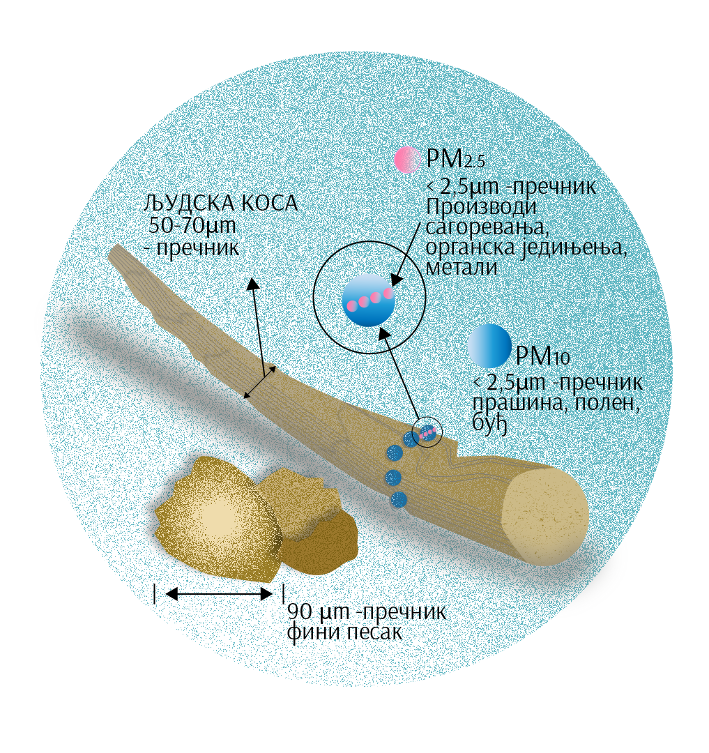 Када је у питању загађење ваздуха, које потиче од тих малих честица, закључено је да су посебно опасне честице мање од 10 микрометара (10 μm), које се означавају као PM10 а нарочито су опасне оне мање од 2,5 микрометра (2,5 μm), чија је ознака PM2,5. На слици можеш видети величину честица PM10 (плаве куглице) и PM2,5 (црвене куглице) у поређењу са пречником људске косе или величином зрнаца најфинијег песка.