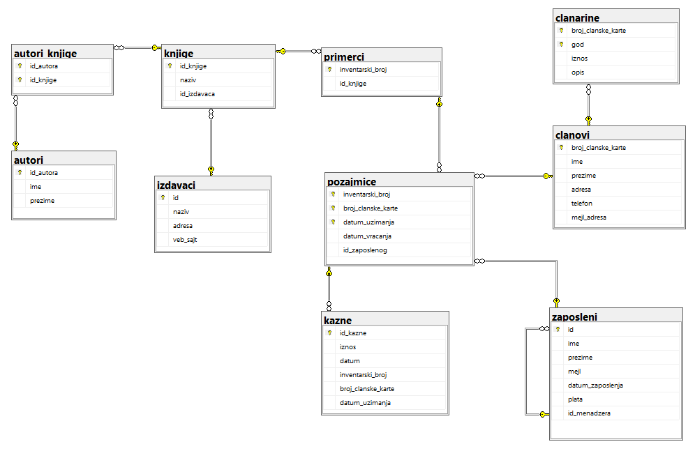 Упознаћемо SELECT упит кроз пример базе података библиотеке. Следи списак свих табела са колонама. Примарни кључеви су истакнути болдом, а страни италиком.