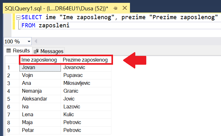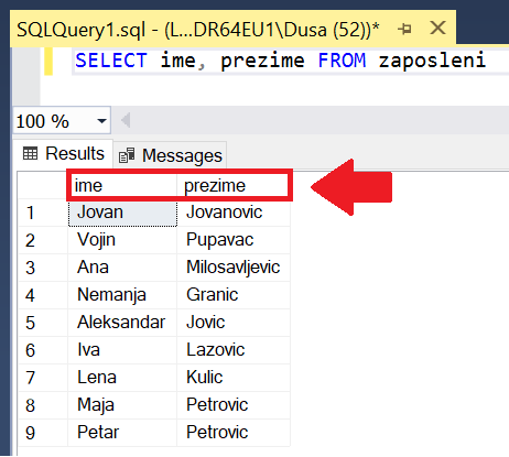 Подразумевано се приликом приказа резултата као заглавља колона резултата прикажу називи колона из табела базе података. Ово је обележено на следећој слици.