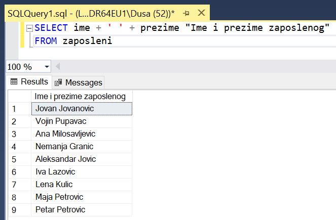 SELECT ime + ' ' + prezime "Ime i prezime zaposlenog" FROM zaposleni