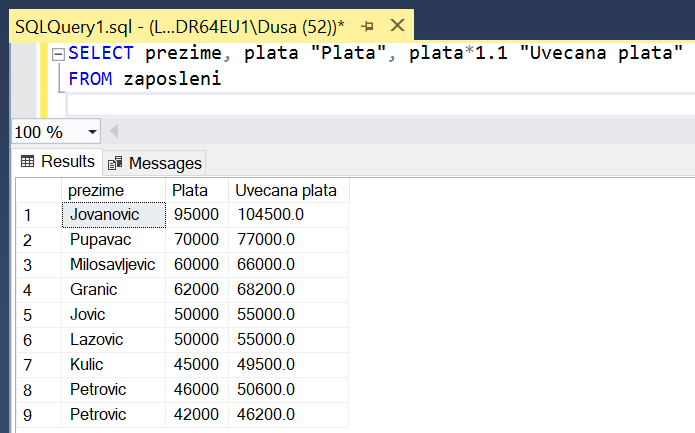 Има смисла да име и презиме запосленог прикажемо у једној колони резултата. То постижемо употребом оператора за спајање (надовезивање) текстуалних података: + (плус).