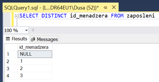 Може се уочити да се у резултату исти идентификациони број појављује више пута, зато што исти менаџер има више запослених у свом тиму. Да би се избегли ови дупликати, потребно је додати реч DISTINCT.