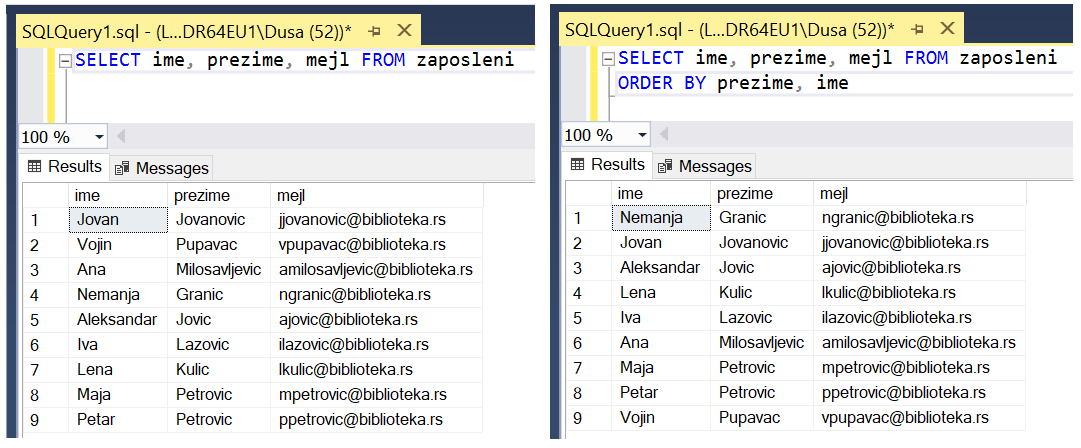 На следећој слици се види резултат упита без дела са сортирањем, и резултат упита након што се дода део ORDER BY.