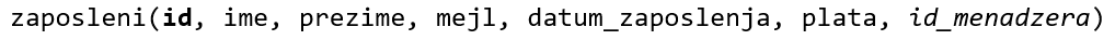 Ови подаци, и презиме менаџера и презиме запосленог, налазе се у истој табели која има страни кључ id_manadzera који показује на примарни кључ исте табеле id.