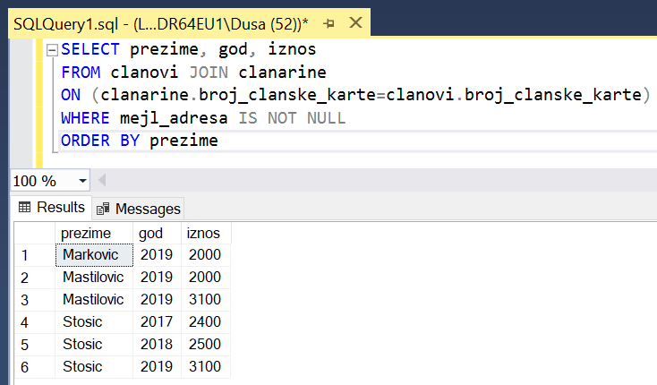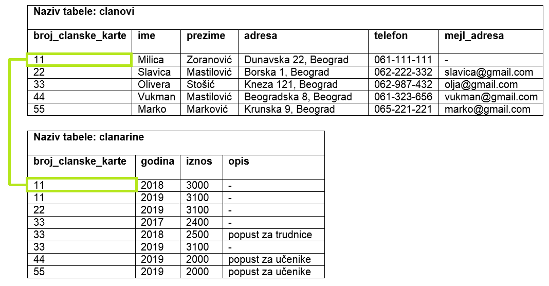 Ова два података се налазе у различитим табелама које су повезане. Потребно је спојити те табеле и то тако што се упореде по једнакости вредности страног кључа и одговарајућег примарног кључа. У овом случају стани кључ је колона broj_clanske_karte, која се налази у табели clanarine, а примарни кључ је колона која се зове исто broj_clanske_karte и налази се у табели clanovi. Након кључне речи FROM наводимо називе табела које спајамо и између кључну реч JOIN, после чега следе кључна реч ON и услов спајања. Како у ове две табеле постоје колоне које се зову исто, када пишемо услов спајања, потребно је да испред назива колоне додамо и назив табеле да би се знало на коју колону се мисли.