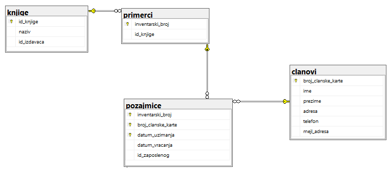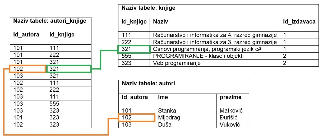 Подаци који се иначе виде заједно на једном месту, у бази података се чувају у различитим табелама. Већ смо анализирали, на пример, корице једног примерка књиге. На тим корицама је назив књиге, као и основни подаци о ауторима и издавачу. Сви ови подаци се у бази података, што смо већ научили, чувају у четири табеле: knjige, autori, izdavaci и primerci. Ово је веома важно и максимално спречава непотребно понављање података и смањује могућност за настајање разних грешака.