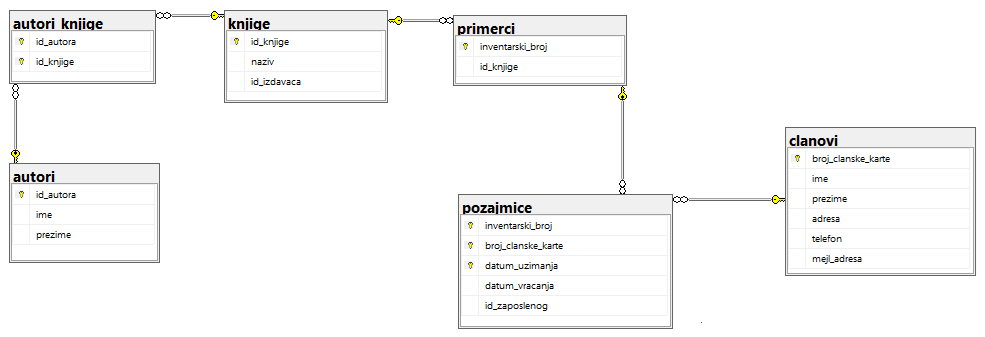 Иако су нам потребна два податка који се налазе у две различите табеле, назив књиге из табеле knjige и име аутора из табеле autori, ове табеле нису директно повезане па, да бисмо добили жељене податке, морамо да повежемо три табеле.