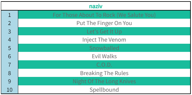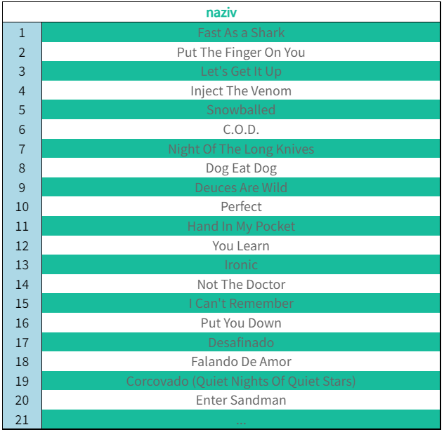 1. Прикажи све називе песама са албума чији је идентификатор 1.