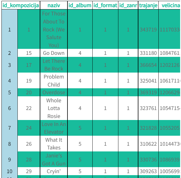 Сви SELECT упити који следе обрађују податке из базе података фиктивне компаније за продају музичких композиција (углавном песама). Следи списак свих табела са колонама. Примарни кључеви су истакнути болд, а страни италик.