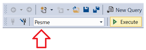 Упити се пишу и покрећу када се кликне New Query након што се покрене систем SQL Server и кликне на креирану базу Pesme у прозору Object Explorer. Фајл са упитима SQLQuery1.sql може, али и не мора да се сачува.