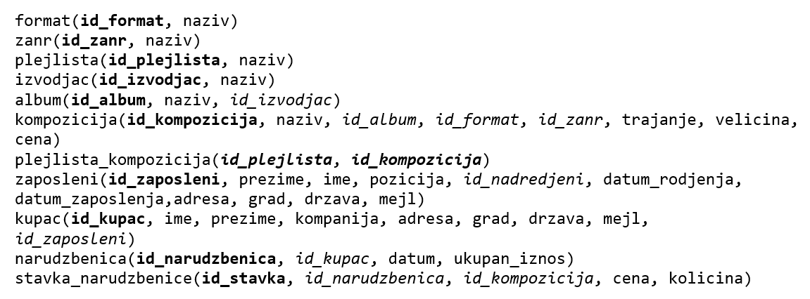 Сви наредни SELECT упити обрађују податке из базе података фиктивне компаније за продају музичких композиција (углавном песама). Следи списак свих табела са колонама. Примарни кључеви су истакнути болдом, а страни италиком.