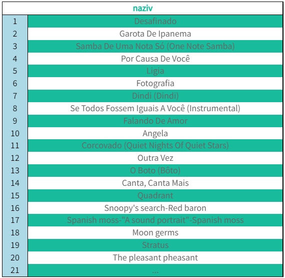 Прикажи називе свих џез композиција (жанр је „Jazz”).