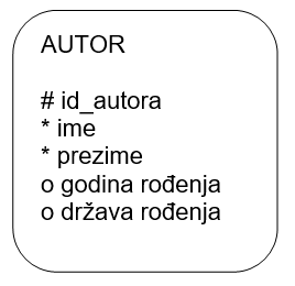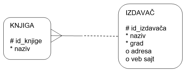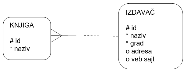 Атрибути који су обележени кружићем су опциони, тј. ти подаци не морају да се унесу у базу. Када податак није унет, то поље нема вредност, односно садржи константу null (недостајућа вредност, тј. показивач на ништа, на празно). Атрибути који су обавезни постају колоне које имају ограничење not null.