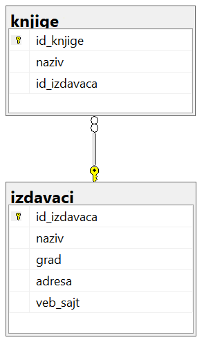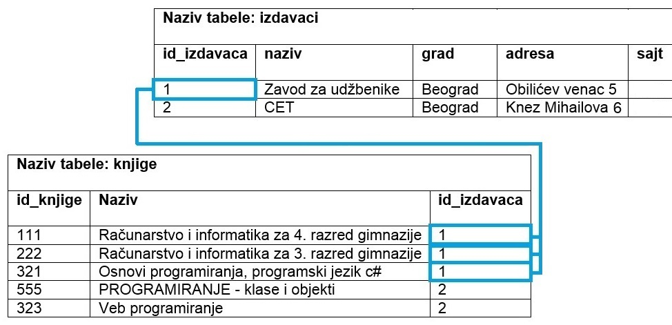 Само информативно, следе одговарајуће CREATE TABLE команде. Уколико шифра, ID, има седам цифара, таквих бројева има 107, па је то број различитих вредности, тј. број могућих различитих редова у одговарајућој табели. Страни кључ, колона id_izdavaca, у табели knjige показује на примарни кључ, колону id_izdavaca, табеле izdavaci.