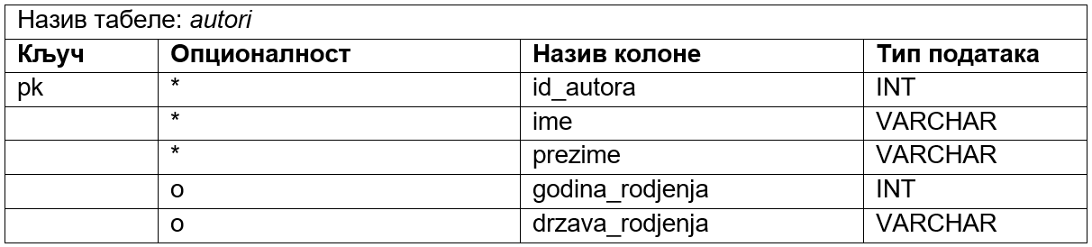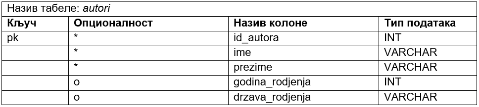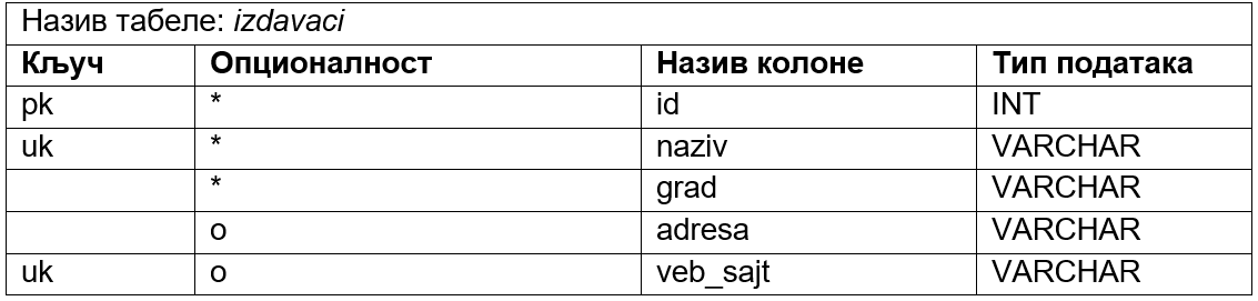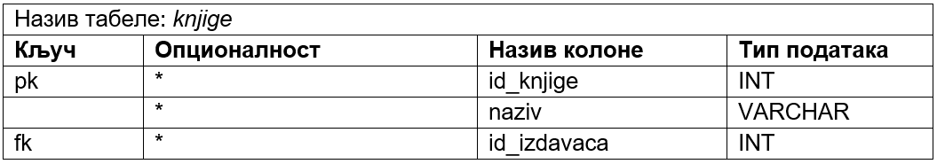 Следе помоћне табеле, односно дизајн будућих табела у бази података, за ове ентитете. У различитим табелама могу да постоје колоне са истим називом, али, наравно, различитим значењем. Колона id у табели izdavaci је шифра (идентификациони број) издавача, а колона id у табели knjige је шифра књиге.