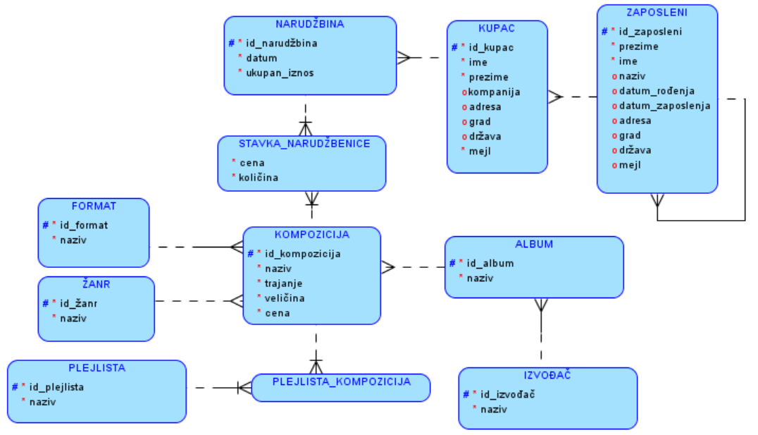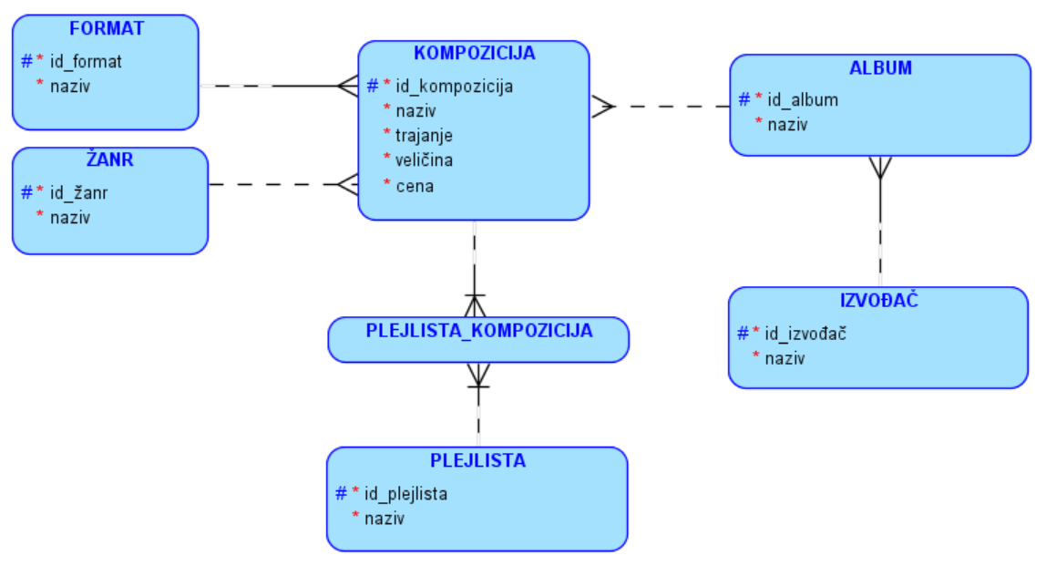 На крају, свака наруџбеница садржи нула или више композиција, док се свака композиција може налазити на нула или више наруџбеница. Ову везу типа више-према-више морамо реализовати креирањем посебне табеле STAVKA_NARUDZBENICE, која ће имати и своје додатне атрибуте који се односе на број композиција које се наручују и јединичну цену те композиције у склопу те наруџбине.