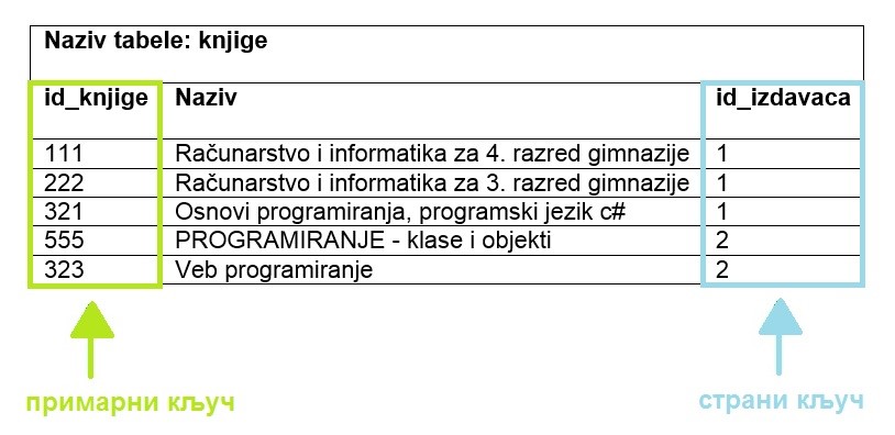 Ова посебна колона се зове страни кључ и служи да се табеле повежу. Помоћу вредности у овој колони видимо како су подаци у једној табели, на пример књиге, повезани са подацима у другој табели, на пример са издавачима. На следећој слици може да се види да је, на пример, 2 вредност шифре издавача (вредност страног кључа, id_izdavaca) за књигу „Веб-програмирање“. Већ смо видели да је у табели у којој се налазе подаци о издавачима, СЕТ издавач са шифром 2 (вредност примарног кључа те табеле, id). На описани начин може за сваку књигу да се пронађе која издавачка кућа ју је објавила. Вредности које се налазе у колони која је страни кључ увек одговарају вредностима које се налазе у колони која је примарни кључ друге табеле.