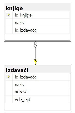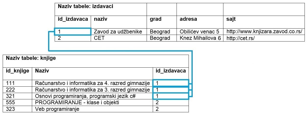 Подаци који се у животу виде заједно на једном месту, у бази података се чувају у различитим табелама. Уколико погледаш корице неке књиге, највероватније ћеш на њима видети назив књиге, као и основне податке о аутору или ауторима, и издавачу. Ови подаци се у бази података чувају у неколико различитих табела: knjige, autori и izdavaci. Неопходно је и веома важно да имамо механизам на основу којег можемо да видимо како су подаци у једној табели, на пример подаци о једној конкретној књизи, повезани са одговарајућим подацима у другим табелама, тако да можемо да видимо ко је аутор те књиге и ко је издавач те исте књиге.