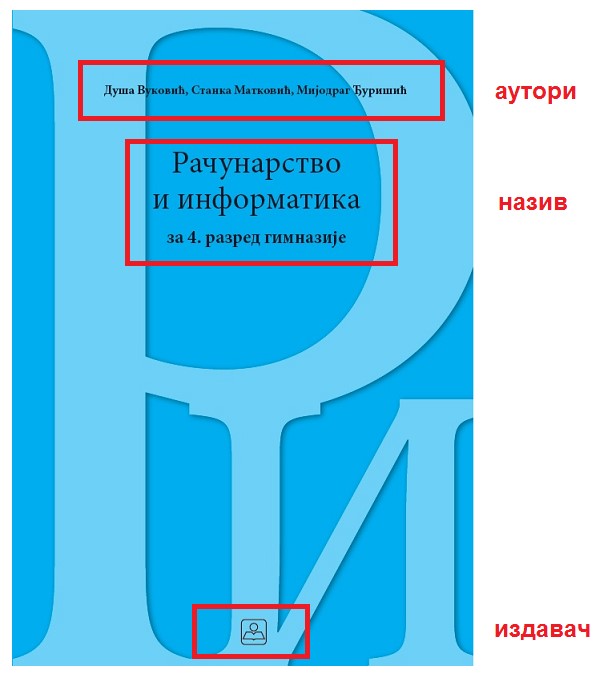 Погледајмо сада, на пример, корице једног примерка књиге. На тим корицама видимо назив књиге, као и основне податке о ауторима и издавачу.