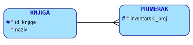 Погледаћемо још један пример везе један-према-више. У библиотеци најчешће имамо више примерака исте књиге и те појединачне примерке издајемо члановима. Сваки примерак има свој инвентарски број.