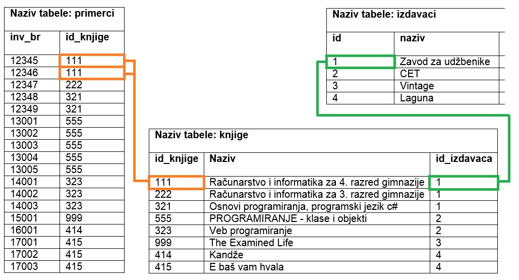 На следећој слици је приказано како би ове табеле, повезане кључевима, изгледале у бази података. У боји су означени управо подаци о којима је до сада било речи. Примерци са инвентарским бројевима 12345 и 12346 су примерци исте књиге са идентификационим бројем 111. У табели knjige се види да је књига са идентификацијом 111: „Рачунарство и информатика за 4. разред гимназије“, а вредност страног кључа који садржи идентификацију њеног издавача: 1. У табели izdavaci се види да је издавач са идентификацијом 1: „Завод за уџбенике“.