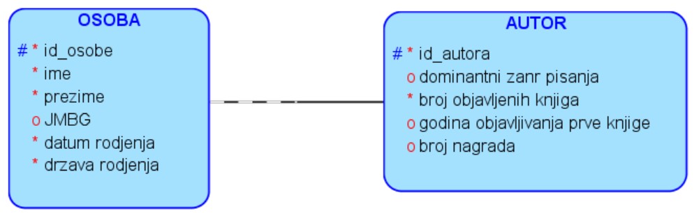 Споменућемо кратко и везу један-према-један која се ретко појављује. Следи пример у којем издвајамо податке о личности аутора у један ентитет, а податке о његовом професионалном учинку у други (особа и улога). Ова веза се такође у релационој бази података имплементира тако што додамо још једну колону у једну од две табеле. Има смисла додати колону у ону табелу која одговара слабијем ентитету. По природи ствари, ентитет OSOBA је јачи од ентитета AUTOR који само описује професионални учинак особе на пољу писања књига, па ће се у табелу autori додати страни кључ id_osobe. Разлика у односу на везу један-према-више је та што, у случају везе један-према-један, страни кључ мора да има и ограничење UNIQUE.