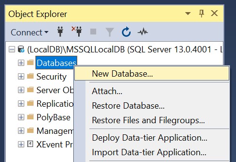 Кликнути десни тастер миша над Databases у прозору Object Explorer и изабрати New Database…