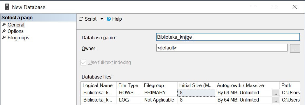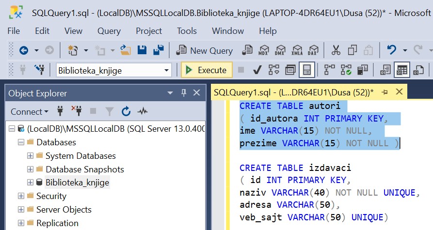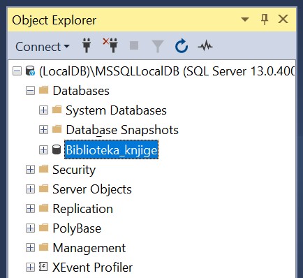 Употребом алата SQL Server Management Studio креираћемо базу података која може да се посматра као део базе података за библиотеку у којој се складиште подаци о свим примерцима књига које се налазе у библиотеци.