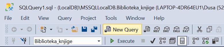 Кликнути дугме New Query испод главног падајућег менија. Обратити пажњу на назив базе података доле лево у односу на дугме New Query. Уколико већ постоји више база података у овом алату зато што је раније коришћен, потребно је изабрати новокреирану.